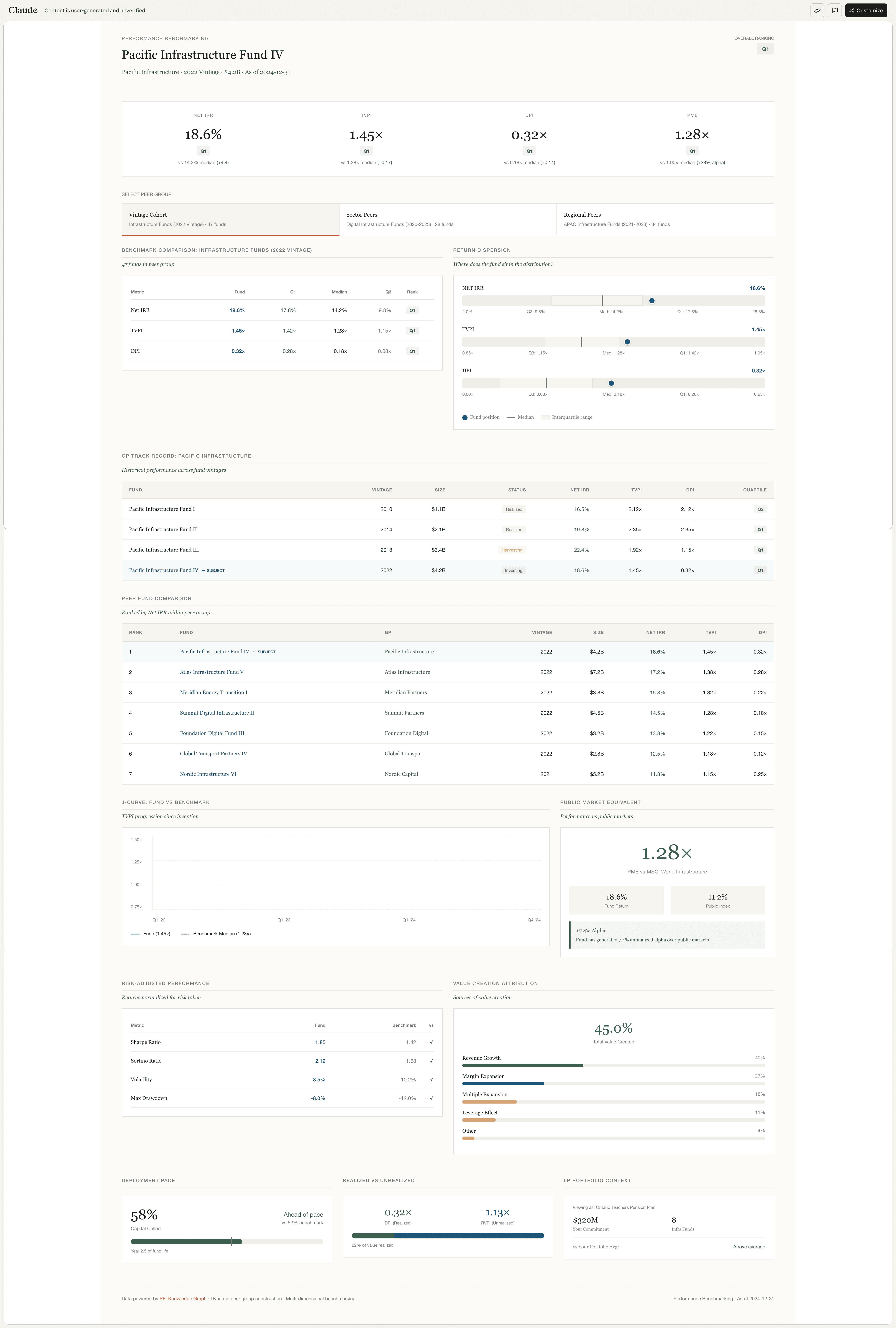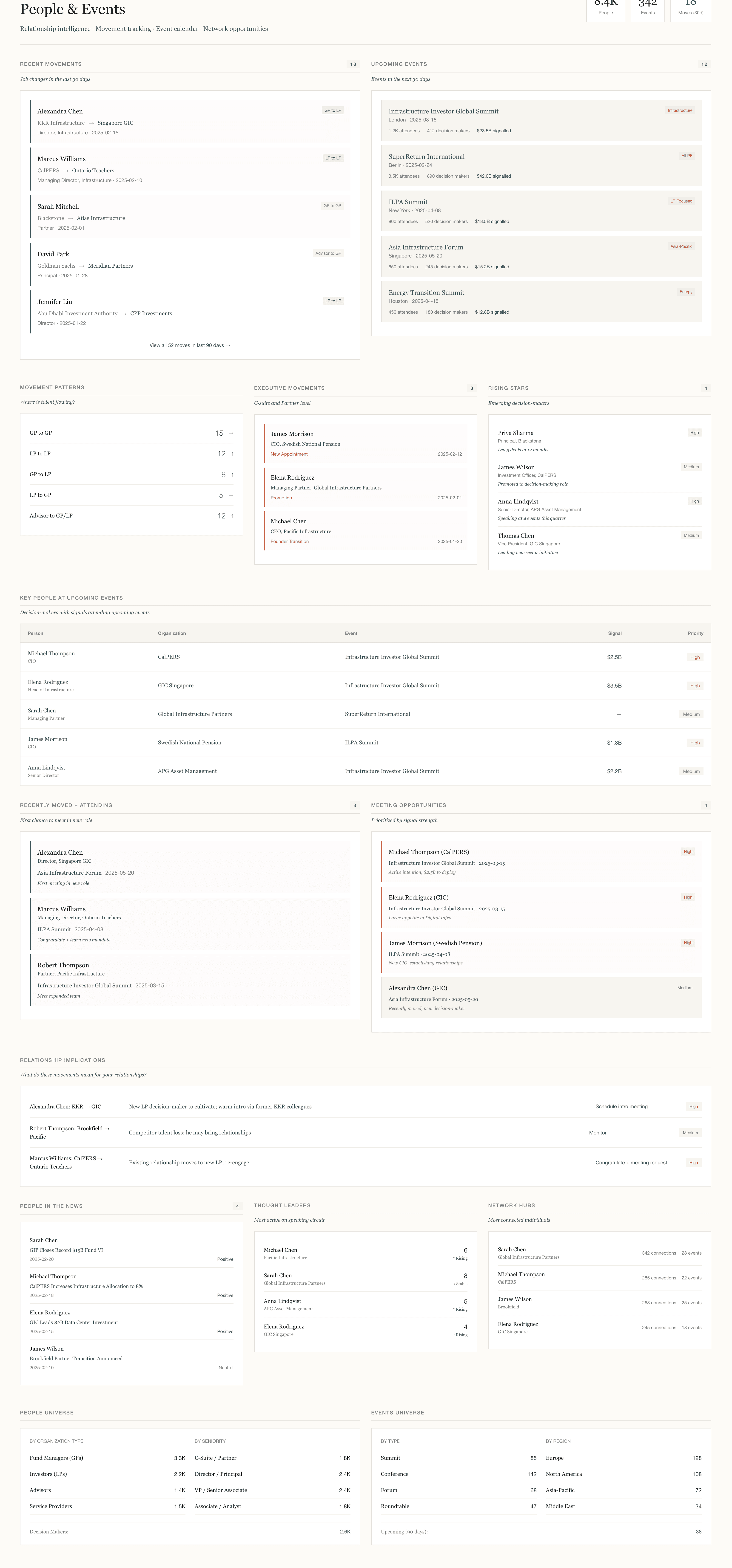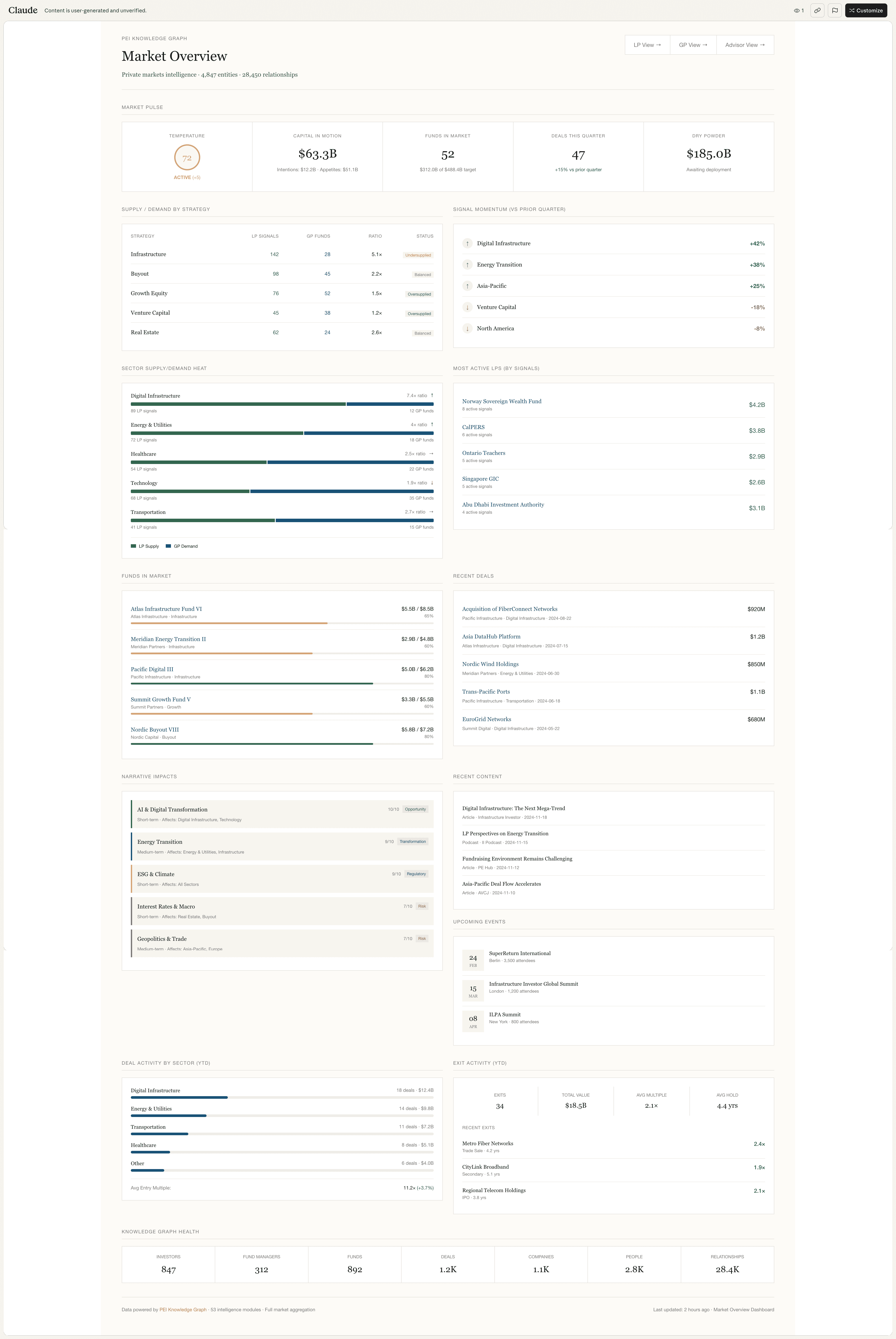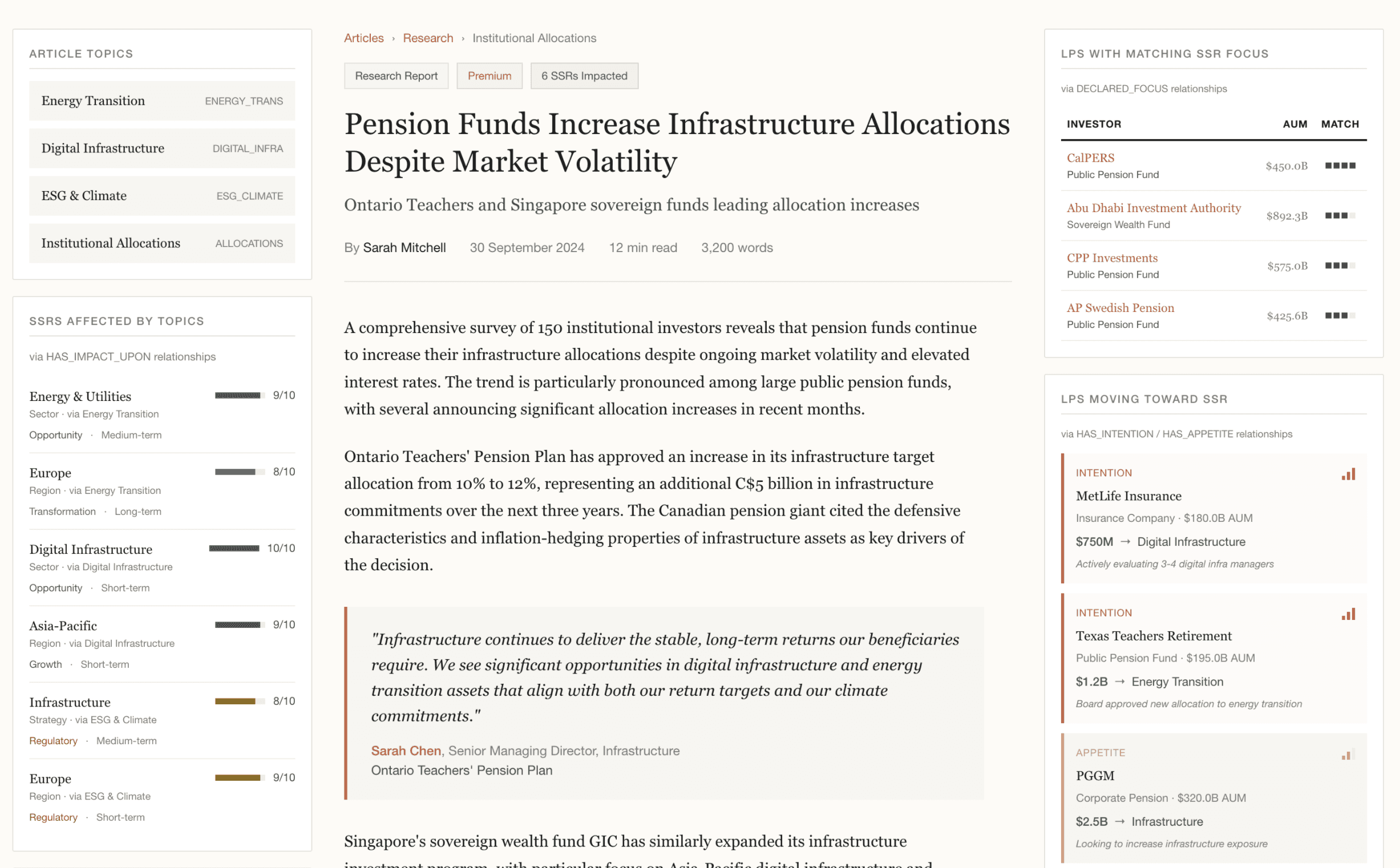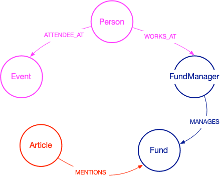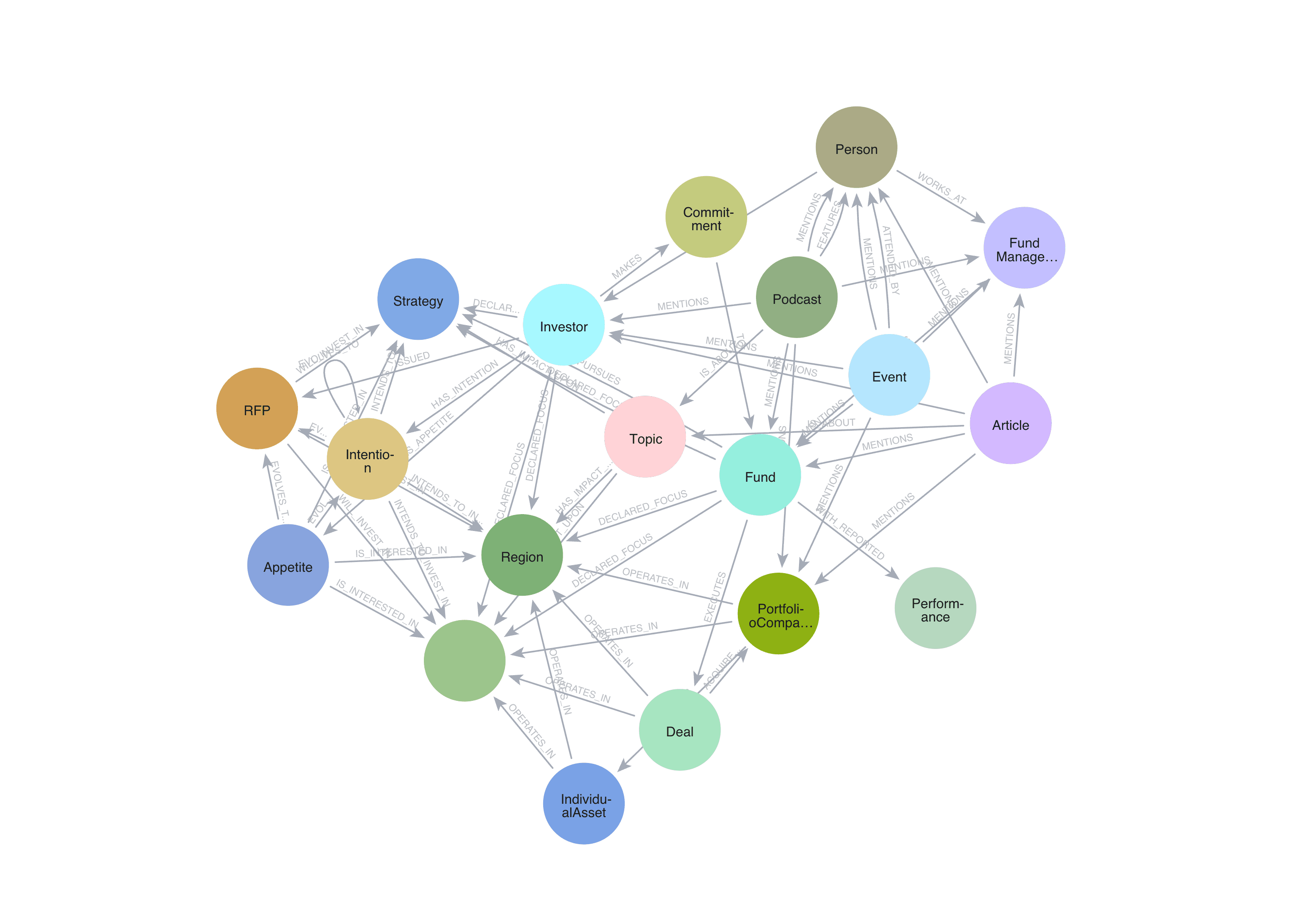 A knowledge graph design for a private equity intelligence platform, modelling the relationships between investors, fund managers, funds, deals, people, events, and editorial content; then showing what those relationships make possible in the product.